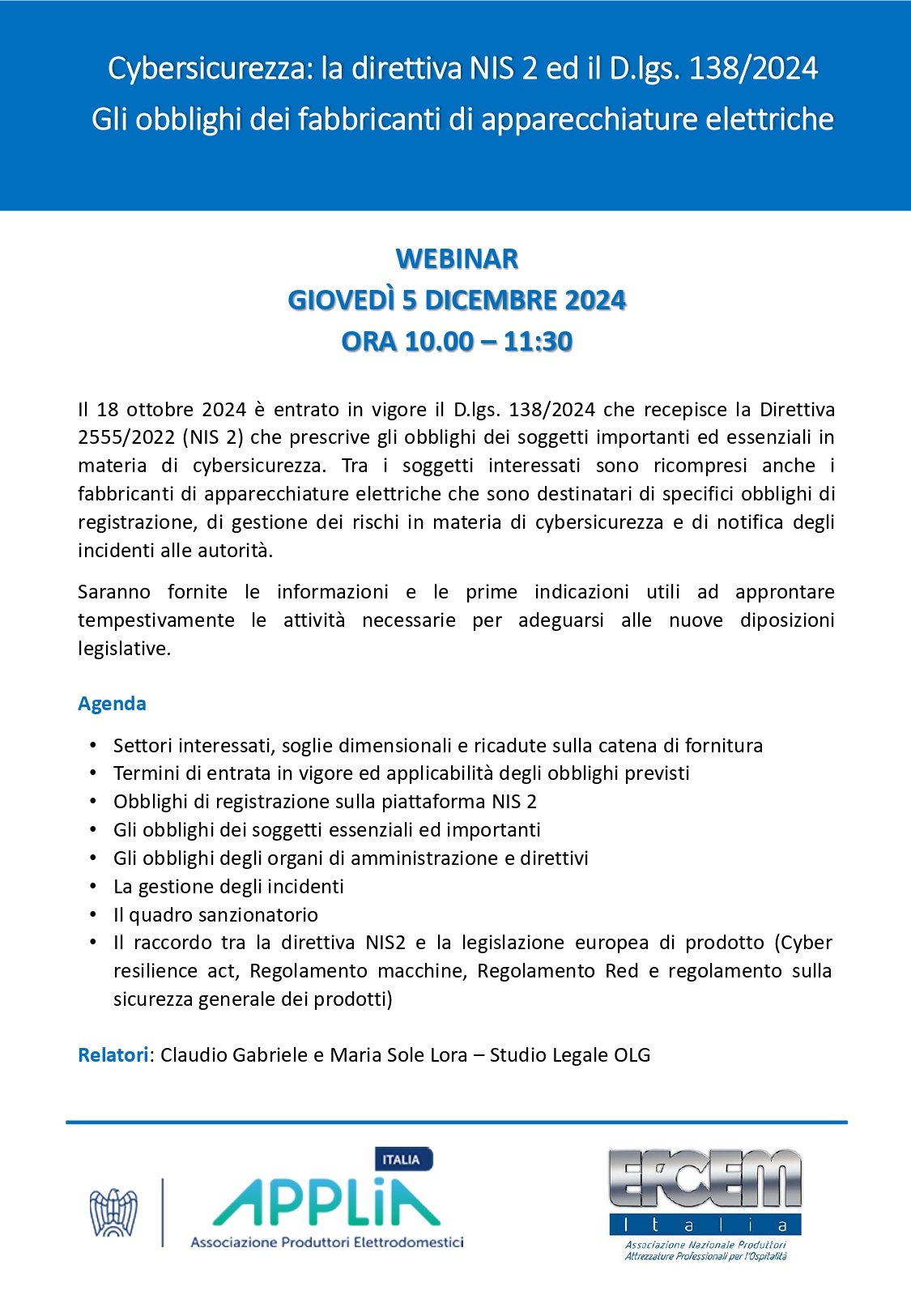 Il 18 ottobre 2024 è entrato in vigore il D.lgs. 138/2024 che recepisce la Direttiva 2555/2022 (NIS 2) che prescrive gli obblighi dei soggetti importanti ed essenziali in materia di cybersicurezza. Tra i soggetti interessati sono ricompresi anche i fabbricanti di apparecchiature elettriche che sono destinatari di specifici obblighi di registrazione, di gestione dei rischi in materia di cybersicurezza e di notifica degli incidenti alle autorità. Saranno fornite le informazioni e le prime indicazioni utili ad approntare tempestivamente le attività necessarie per adeguarsi alle nuove diposizioni legislative.