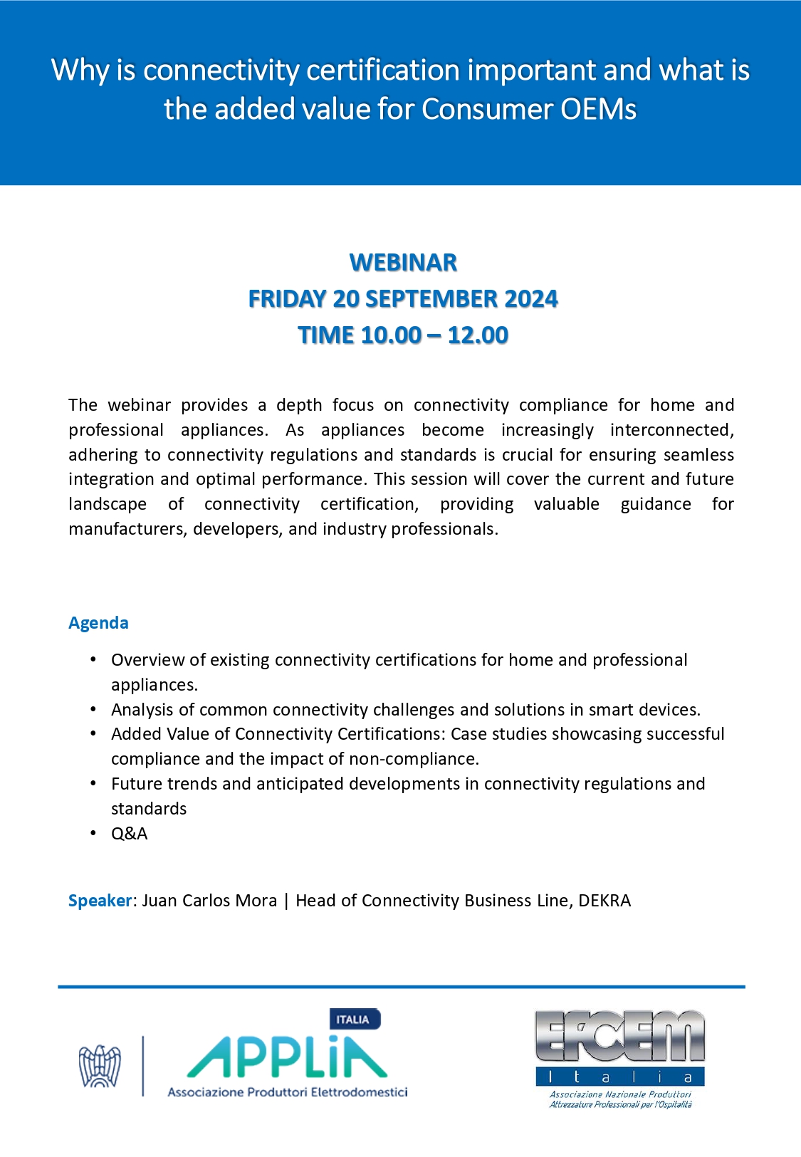APPLiA Italia, in collaborazione con DEKRA, ha organizzato per venerdì 20 settembre il webinar “Why is connectivity certification important and what is the added value for Consumer OEMs”.