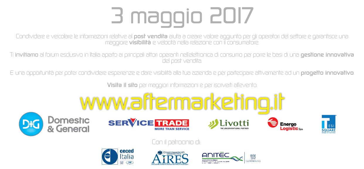 Per avere ulteriori informazioni in merito ai contenuti, il programma ed i relatori, visiti il sito www.aftermarketing.it oppure clicchi QUI per iscriversi all’evento.