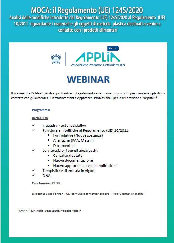 APPLiA Italia, in collaborazione con UL, ha organizzato un webinar riservato ai Soci Venerdì 19 Marzo sul tema: “MOCA: Il Regolamento UE 1245/2020. Analisi delle modifiche introdotte al Regolamento (UE) 10/2011 riguardante i materiali e gli oggetti di materia plastica destinati a venire a contatto con i prodotti alimentari”.